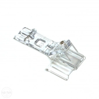 Dieser Nähfuss näht Bänder oder Spitzen unter eine Stoffkante, welche zugleich zum Saum gefaltet wird. Ein Coverstich versäubert gleichzeitig beide Kanten. Dabei wird das Material 1 cm gefaltet.
