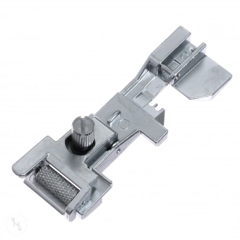 Eine Rolle sorgt dafür, dass das Gummiband beim Einnähen permanent angespannt bleibt, eine Druckregulierschraube ist für die Dehnstärke zuständig. Dieser Fuss ist ideal für Lingerie, Bade- und Sportbekleidung, Tanzkleidern und Heimtextilien.