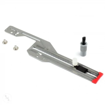 Der BERNINA Kreisstickapparat Nr. 83 eignet sich ideal zum Nähen von ausgefallenen und dekorativen Kreisen oder Halbkreisen. Hierzu wird die Vorrichtung am Freiarm festgeschraubt, der Drehpunkt kann dabei entweder links oder rechts liegen. Die Fixierschraube ist hierbei so flach, dass der Stofftransport nicht gestört wird. Am Schlitten lässt sich ein Radius zwischen 2,5 bis 13,5 cm einstellen. Der Stoff wird auf die Drehpunktspitze gesteckt und mit einer Gummikappe fixiert. So kann beim Nähen nichts verrutschen.