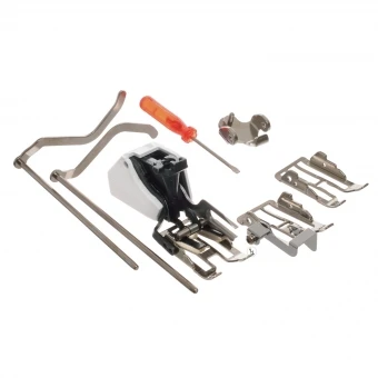 Zwei Kantenlineale, die auf der Fußrückseite des Obertrasportfußes mit einem Bügel fixiert werden können, eine Quiltsohle und eine Schmalkantensohle gehören dazu.