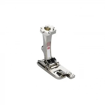 Der Stoff wird von vorne der Schnecke zugeführt, welche den Stoff doppelt einschlägt und so einen schmalen, festen Saum bildet. Die 6 mm breite Führung in der Fußsohle hält die eingeschlagene Stoffkante zusammen bis zum Stichloch und lässt anschließend den genähten Saum reibungslos weiter unter dem Fuß durchgleiten.