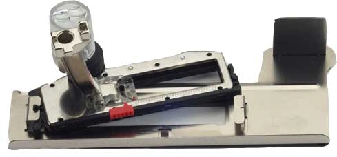 Der Knopflochschlittenfuß 3A/3B wird in die Transporthilfe eingesetzt, dadurch entsteht ein Knopflochnähfuß mit besonders breiter Sohle.Dabei bieten die beiden Bleche eine zusätzliche Transportfläche und drücken das Material gelichmäßig an.