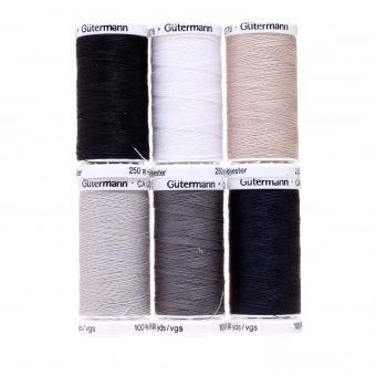 Das GÜTERMANN Nähfaden-Set Allesnäher enthält sechs Spulen mit je 250 m in gedeckten Standardfarben.