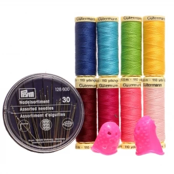 In diesem praktischen GÜTERMANN Nähfaden-Set befinden sich 8 Allesnäher-Garne 100 m in verschiedenen Farben, 30 Handnähnadeln von PRYM sowie zwei unterschiedlich große PRYM Nadelgreifer aus Silikon.
