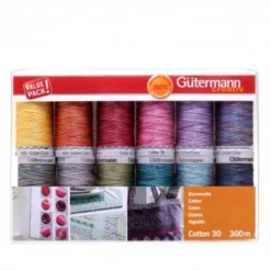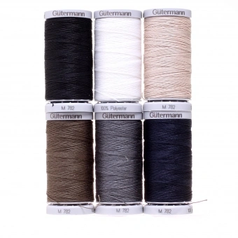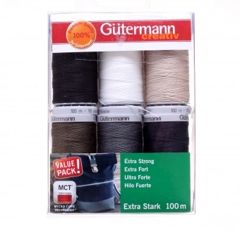 Das GÜTERMANN Nähfaden-Set Extra Stark enthält 6 Spulen mit je 100 m Garn in Weiß, Schwarz, Beige, Grün, Grau und Blau.