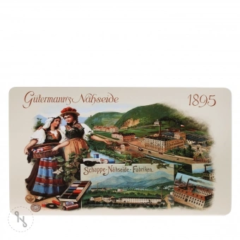 Die Aufbewahrungsbox mit nostalgischem Werbemotiv von GÜTERMANN beinhaltet 48 Spulen Allesnäher 100 m.
