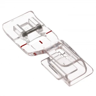 Bei diesem Nähfuß werden Basisstoff und dekorativer Stoff, z.B. Spitze, durch die vorderen Öffnungen geführt, der Sfoff wird umgelget und gleichzeitig miteinander verbunden.