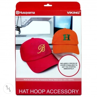 Alle Arten von Kopfbedeckungen können mithilfe des HUSQVARNA VIKING® Kappenrahmen-Zubehörs ganz einfach mit individuellen Designs bestickt werden. Dabei eignet sich der 180 x 130 mm große Magnet-Metallrahmen sehr gut zum Arbeiten mit dieser Ergänzung.