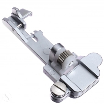 Mit diesem Gummiband – Annähfuß läßt sich ein Gummiband an das Kleidungsstück annähen, wobei je nach Bedarf bestimmt werden kann, wie fest sich das Material zusammenziehen soll. Ebenso kann man ein Baumwollband bei elastischem Material, so an die Stoffkante nähen, dass ein Ausdehnen der Nähte verhindert wird.