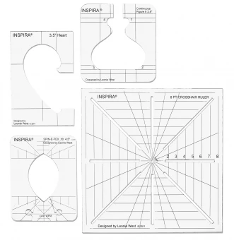 Das INSPIRA Quiltschablonen-Set für Rulerwork enthält vier verschiedene Plexiglas-Schablonen mit denen in Kombination von speziellen Rulerfüßen kreative Quiltdesigns wie Herzen, Kleeblätter und Blumen erstellt werden können.