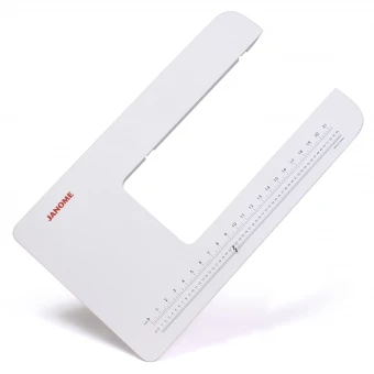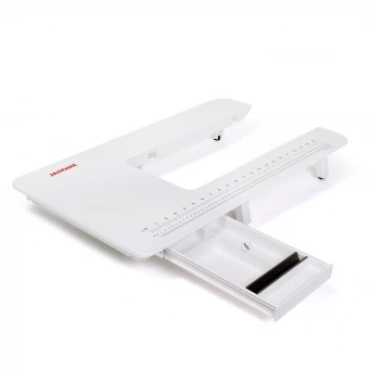Der extra große Anschiebetisch von JANOME vergrößert die Nähfläche und bietet Platz für anspruchsvolle und große Nähprojekte. Das aufgedruckte Lineal hilft dabei Abmessungen leichter vorzunehmen. Zudem besitzt der Tisch ein prakisches Fach in dem kleinere Zubehörteile aufbewahrt werden können und so immer schnell zur Hand sind. Die Stellfüße unter dem Tisch sind klappbar und geben dem Anschiebetisch die nötige Stabilität.