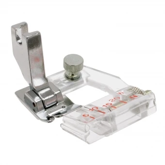 Mithilfe des JANOME Bandnähfußes können Bänder problemlos angenäht werden. Hierzu wird der Abstand der Naht zur Bandkante durch die Justierschraube eingestellt. Die Messmarkierung dient dabei als Orientierungshilfe. Besonders nützlich beim Einnähen von Bändern an Armausschnitten und Schulternähten, da hierbei die Naht verstärkt und ein Ausdehen vermieden wird.