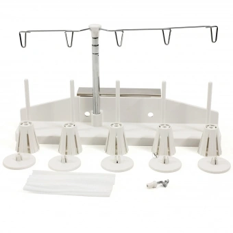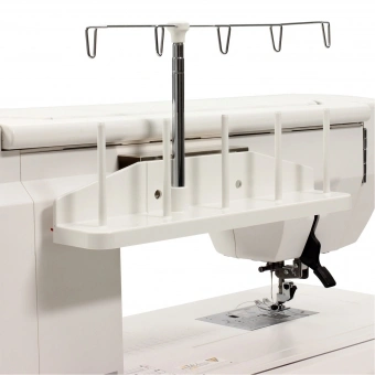 Mit dem JANOME Mehrfachgarnrollenhalter können bis zu fünf große Garnkonen zum Nähen oder Sticken verwendet werden. Durch den ausziehbaren Teleskopfadenmast wird der Faden optimal zur Maschine geführt. Der Garnrollenhalter wird mit Schrauben an der Maschine befestigt.