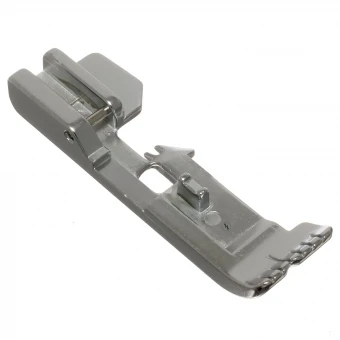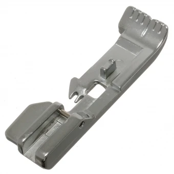 Der Fuß verfügt über eine speziell eingearbeitete Führungsnut auf der Fußunterseite. In dieser Nut wird das Paspelband oder der Keder exakt geführt. Man kann somit Paspelband professionell zwischen zwei Stofflagen einnähen oder eine Kederschnur einfassen.