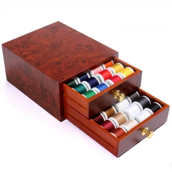 Ausgesuchte Garne und Farben sind in zwei herausnehmbaren Schubladen angeordnet und jede Farbe hat ihren eigenen Platzhalter mit Farbnummer und Farberkennung. Das Nachfüllen der fehlenden Farbe wird zum Kinderspiel und Ihre Lieblingsfarben sind jederzeit schnell aufgeräumt in Ihrer kleinen Garnschatulle.