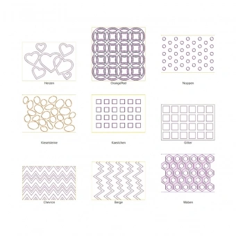 In den Stickmustern enthalten sind neun fertige grafische Muster: Berge, Chevron, Gitter, Herzen, Kästchen, Kieselsteine, Noppen, OrangePeel und Waben.