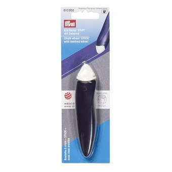 Dieser Kreiderad-Stift erzeugt durch ein Zahnrad fein dosierte Kreidelinien auf dem Stoff.