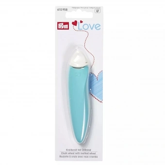 Dieser Kreiderad-Stift erzeugt durch ein Zahnrad fein dosierte Kreidelinien auf dem Stoff.