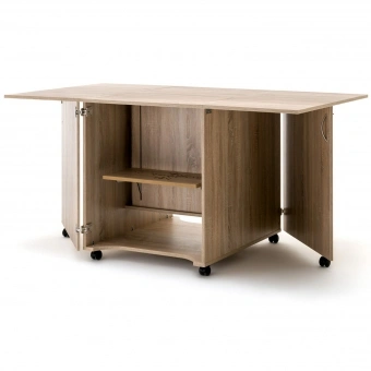 Der RMF Arbeits- und Zuschneidetisch CRAFT DOUBLE ist in fünf verschiedenen Holz-Dekornachbildungen und einer Betonoptik mit Korpus weiß erhältlich. Es gibt auch die Möglichkeit eines Zweitdekors für die Front, die gegen Aufpreis ausgewählt werden kann. Als Beispiel: Korpus Eiche Trüffel mit Front Kristallweiß.