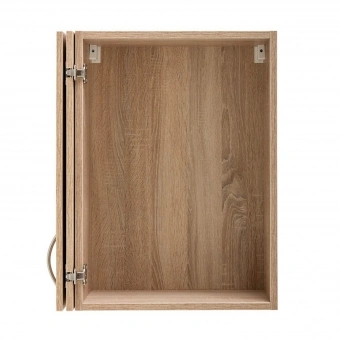 Das RMF Hängeregal mit Falt-Drehtüre links ist in fünf verschiedenen Holz-Dekornachbildungen und einer Betonoptik mit Korpus weiß erhältlich. Es gibt auch die Möglichkeit eines Zweitdekors für die Front, die gegen Aufpreis ausgewählt werden kann. Als Beispiel: Korpus Eiche Sonoma mit der Front in Sienarot.