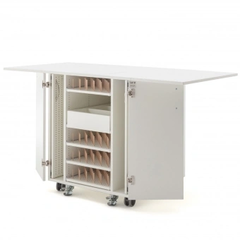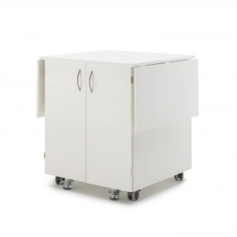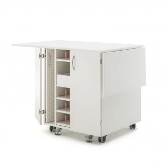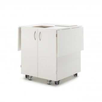 Die Arbeitsfläche ist nach links und rechts durch ausklappbare Platten, welche auf stabilen 270° Falt-Drehtüren Türen abgestützt werden, erweiterbar. Zudem bietet die Arbeitsfläche direkt unter der Stickfläche einen Plattenausschnitt mit Abdeckplatte in dem Maßen 290 mm x 290 mm.