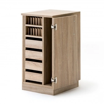 Der RMF Nähzubehör-Container STACK mit Tür rechts ist in fünf verschiedenen Holz-Dekornachbildungen und einer Betonoptik mit Korpus weiß erhältlich. Es gibt auch die Möglichkeit eines Zweitdekors für die Front, die gegen Aufpreis ausgewählt werden kann. Als Beispiel: Korpus Eiche Sonoma mit Front Diamantgrau.