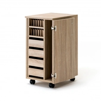 Der RMF Nähzubehör-Rollcontainer ist die passende Ergänzung zu dem Nähmöbel aus der BASE-Serie. Er lässt sich mit verschiedenen Möbelstücken kombinieren oder kann auch einzeln als ideales Aufbewahrungsmöbel für das Nähzubehör aufgestellt werden. Die zwei Schubkästen mit Einteilung sorgen für einen ordentlichen Aufbewahrungsplatz von kleinem Nähzubehör, die zwei Schubkästen ohne Einteilung bieten Platz für größere Accessoires. Durch die beiden Garnrollenauszüge lassen sich Näh- und Stickgarne ideal aufbewahren. In dem Seitenfach finden zum Beispiel eine Rollschneideunterlage oder auch Vliese ihren Platz. Bei dem Möbelstück ist die Tür rechts angebracht und kann mit Rollcontainern oder weiteren Nähmöbeln aus der Serie BASE nach links erweitert und kombiniert werden.