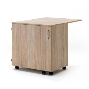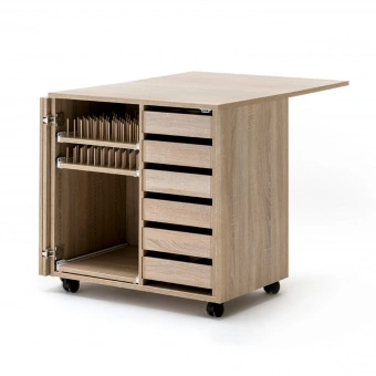 Der RMF Nähzubehör-Rollschrank EXTEND mit Falttür links ist die passende Ergänzung zu dem Nähmöbel aus der EXTEND-Serie. Er lässt sich mit verschiedenen Möbelstücken kombinieren oder kann auch einzeln als ideales Aufbewahrungsmöbel für das Nähzubehör aufgestellt werden. Die Arbeitsfläche lässt sich bei den EXTEND-Möbeln um das doppelte erweitern, sodass eine Gesamttiefe von 1000 mm entsteht. Die Erweiterungsplatte wird von hinten hoch geklappt und mithilfe einer herausklappbaren Stütze stabil gehalten.Auf dem vorhandenen Auszugsboden kann die Overlock bei Nichtgebrauch platzsparend aufbewahrt werden. Die zwei Garnrollenauszüge mit insgesamt 520 Garnrollenlöchern und 260 Garnrollenstiften bieten genügend Platz um die Näh- und Stickgarne übersichtlich zu verstauen. Die drei Schubkästen mit Einteilung sorgen für einen ordentlichen Aufbewahrungsplatz von kleinem Nähzubehör, die drei Schubkästen ohne Einteilung bieten Platz für größere Accsesoires. Bei dem Möbelstück ist die Tür links angebracht und kann mit Rollcontainern oder weiteren Nähmöbeln aus der Serie EXTEND nach rechts erweitert und kombiniert werden.