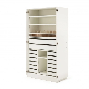 Das RMF Ordnungssystem STORE lux mit zwei 270° Drehtüren bietet viel Platz für das komplette Nähzubehör. In drei verstellbaren Einlageböden lassen sich Stoffe optimal aufbewahren. Auf dem vorhandenen Auszugsboden kann eine Nähmaschine oder Overlock bei Nichtgebrauch platzsparend aufbewahrt werden. In den zwei Garnrollenauszügen mit insgesamt 550 Pins und 1100 Löcher lassen sich Näh-, und Stickgarne übersichtlich verstauen. Die zwei ausziehbaren Schubladen mit drei und 18 Fächern bieten viel Stauraum für weitere Nähutensilien. In insgesamt 12 herausnehmbaren Holz-Schubkästen, davon sechs mit Unterteilung und sechs ohne Unterteilung, lässt sich noch mehr Zubehör griffbereit aufbewahren.