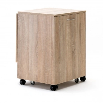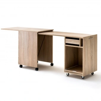 Der RMF Rollcontainer EXTEND mit Auszugscontainer rechts ist der ideale Arbeitsplatz für zwischendurch. Die Arbeitsfläche lässt sich bei den EXTEND-Möbeln um das doppelte erweitern, sodass eine Gesamttiefe von 2000 mm entsteht. Der Auszugscontainer lässt sich komplett einschieben und ist dadurch sehr platzsparend, wenn gerade nicht gearbeitet wird. Während des Nähens bietet dieser im ausgezogenen Zustand eine zusätzliche Arbeitsfläche. Die Erweiterungsplatte wird von hinten hoch geklappt und mithilfe einer herausklappbaren Stütze stabil gehalten. Kleinere Nähutensilien können im enthaltenen Schubkasten aufbewahrt werden. Durch die Bodenauszugsplatte lässt sich zudem eine Maschine perfekt verstauen.
