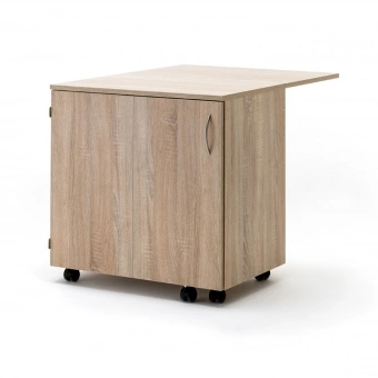 Der RMF Rollschrank mit Fachböden ist der ideale Aufbewahrungsplatz für größeres Nähzubehör wie Vliese, Stoffe und Garnboxen. Die Arbeitsfläche lässt sich bei den EXTEND-Möbeln um das doppelte erweitern, sodass eine Gesamttiefe von 1000 mm entsteht. Die Erweiterungsplatte wird von hinten hoch geklappt und mithilfe einer herausklappbaren Stütze stabil gehalten. Der Container mit Fachböden und Falttür links lässt sich perfekt mit weiteren Möbeln aus der EXTEND-Serie nach rechts erweitern oder kann als einzelnes Möbelstück im Nähzimmer aufgestellt werden.