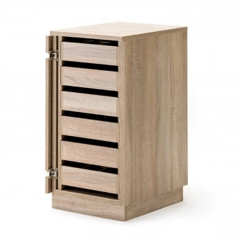 Der RMF Schubladen-Container STACK ist in fünf verschiedenen Holz-Dekornachbildungen und einer Betonoptik mit Korpus weiß erhältlich. Es gibt auch die Möglichkeit eines Zweitdekors für die Front, die gegen Aufpreis ausgewählt werden kann. Als Beispiel: Korpus Eiche Trüffel mit Front Kristallweiß.