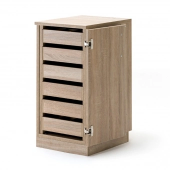 Der RMF Schubladen-Container STACK ist in fünf verschiedenen Holz-Dekornachbildungen und einer Betonoptik mit Korpus weiß erhältlich. Es gibt auch die Möglichkeit eines Zweitdekors für die Front, die gegen Aufpreis ausgewählt werden kann. Als Beispiel: Korpus Eiche Sonoma mit Front Kristallweiß.