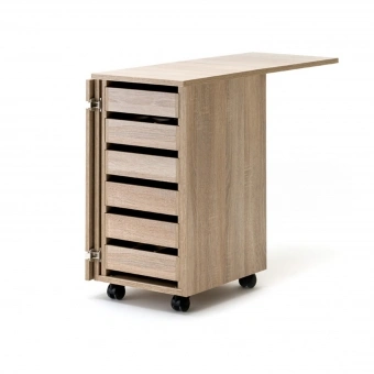 Der RMF Schubladen-Rollcontainer ist die passende Ergänzung zu dem Nähmöbel der Serie EXTEND. Er lässt sich mit verschiedenen Möbelstücken kombinieren und dient als ideales Aufbewahrungsmöbel für das Nähzubehör. Die Arbeitsfläche lässt sich bei den EXTEND-Möbeln um das doppelte erweitern, sodass eine Gesamttiefe von 1000 mm entsteht. Die Erweiterungsplatte wird von hinten hoch geklappt und mithilfe einer herausklappbaren Stütze stabil gehalten. Die drei Schubkästen mit Einteilung sorgen für einen ordentlichen Aufbewahrungsplatz von kleinem Nähzubehör, die drei Schubkästen ohne Einteilung bieten Platz für größere Accsesoires. Bei dem Möbelstück ist die Tür links angebracht und kann mit Rollcontainern oder weiteren Nähmöbeln aus der Serie EXTEND nach rechts erweitert und kombiniert werden.